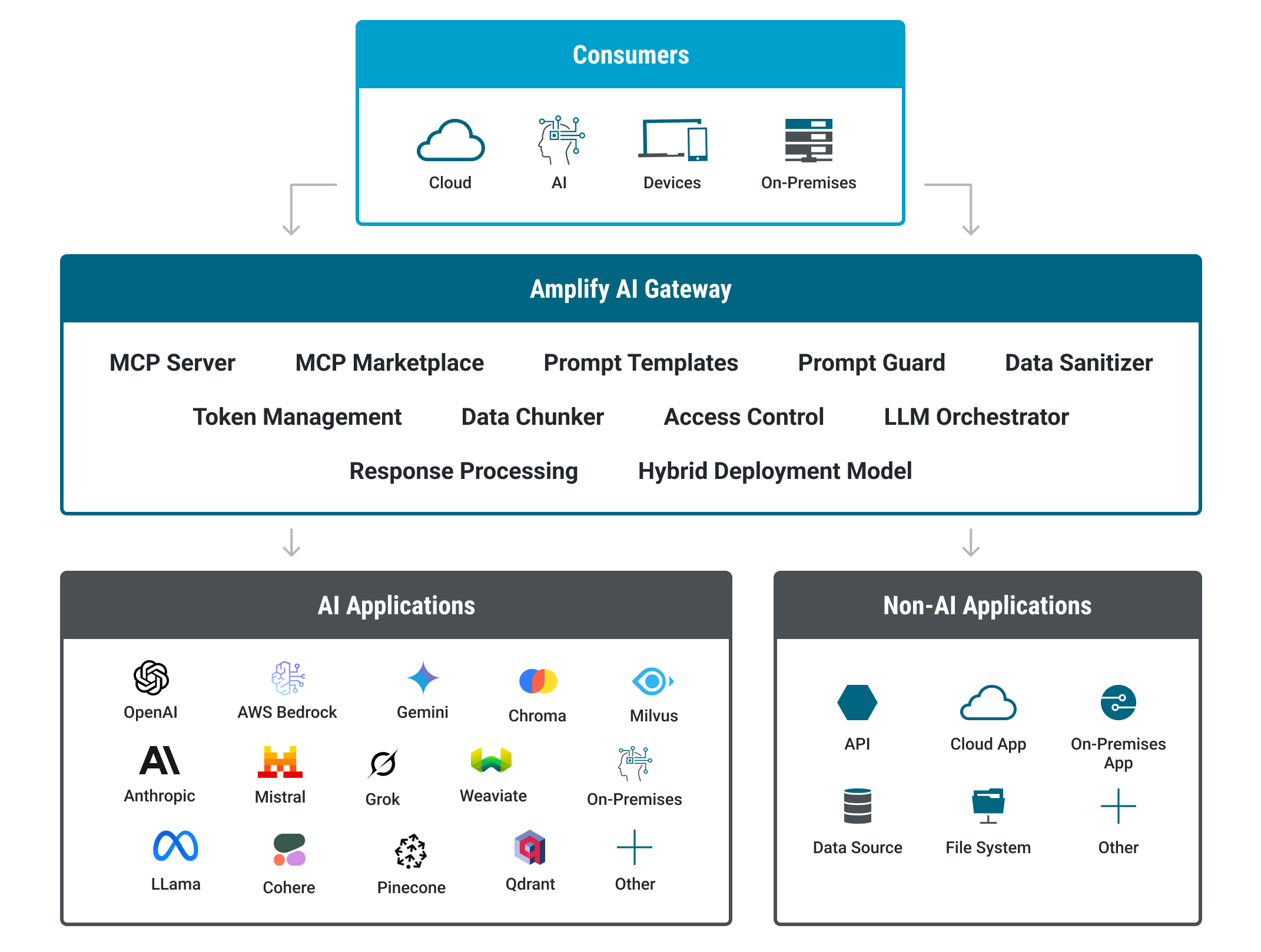 O Amplify AI Gateway atende à demanda por integração de IA segura, compatível e flexível, permitindo que você operacionalize a IA como um componente transparente e governável da arquitetura da sua empresa